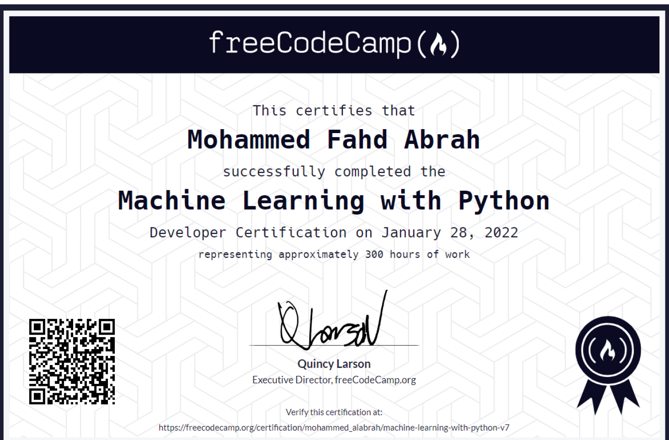 This certification represents structured training in core machine learning concepts and applied model development using Python. It focuses on transforming data into predictive and inferential systems, emphasizing the full learning pipeline: problem formulation, data preparation, model selection, evaluation, and interpretation.